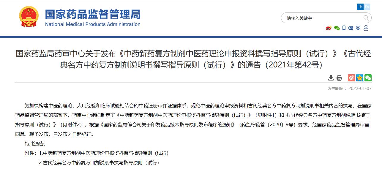 國家藥監(jiān)局藥審中心關(guān)于發(fā)布《中藥新藥復(fù)方制劑中醫(yī)藥理論申報(bào)資料撰寫指導(dǎo)原則(試行)》《古代經(jīng)典名方中藥復(fù)方制劑說明書撰寫指導(dǎo)原則(試行)》的通告(2021年第42號(hào))