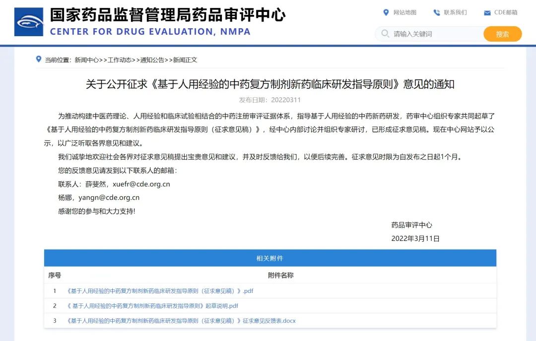 關(guān)于公開征求《基于人用經(jīng)驗(yàn)的中藥復(fù)方制劑新藥臨床研發(fā)指導(dǎo)原則》意見的通知