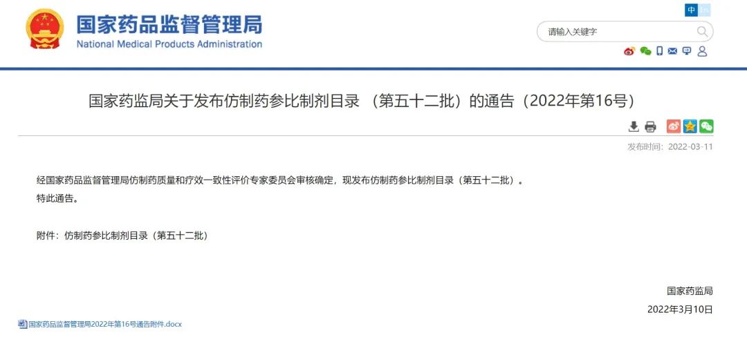 國家藥監(jiān)局關(guān)于發(fā)布仿制藥參比制劑目錄 (第五十二批)的通告(2022年第16號(hào))