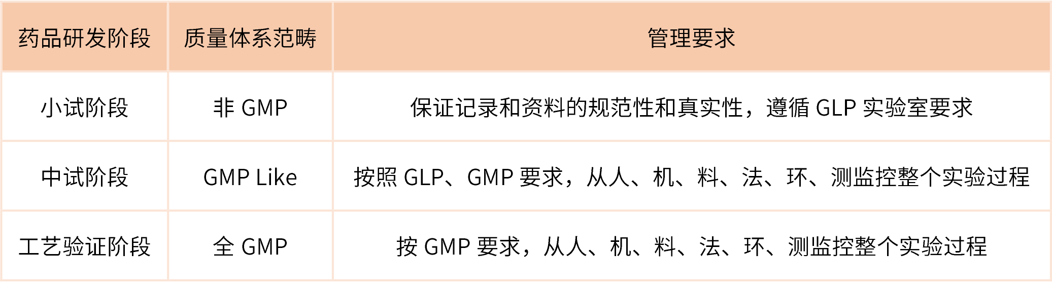 藥品的不同研發階段,對質量體系控制的要求也不同。下表對藥品不同研發階段的質量體系范疇和管理要求進行簡述。