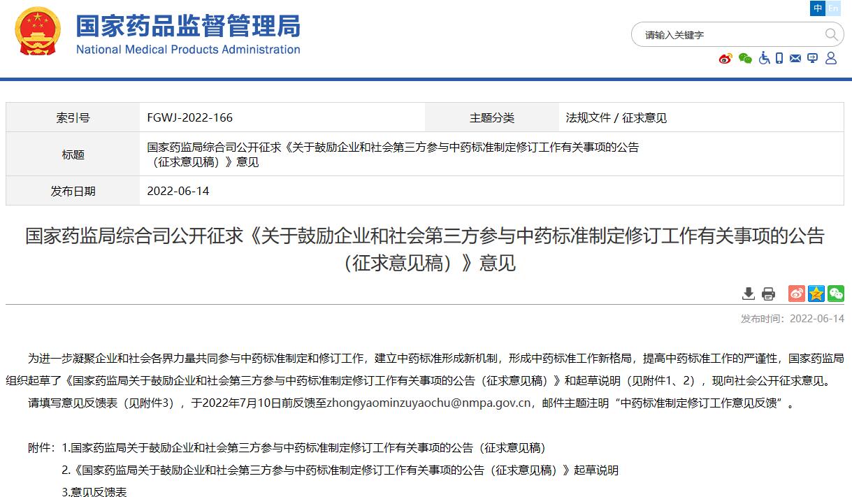國家藥監局綜合司公開征求《關于鼓勵企業和社會第三方參與中藥標準制定修訂工作有關事項的公告(征求意見稿)》意見
