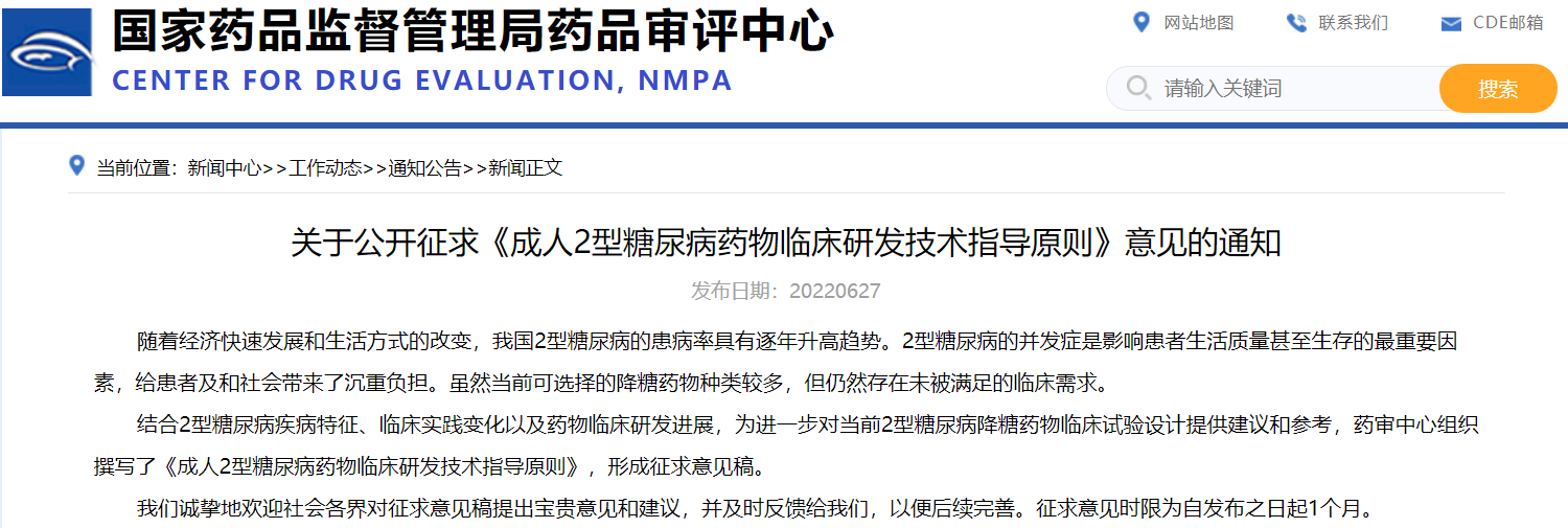 關于公開征求《成人2型糖尿病藥物臨床研發技術指導原則》意見的通知