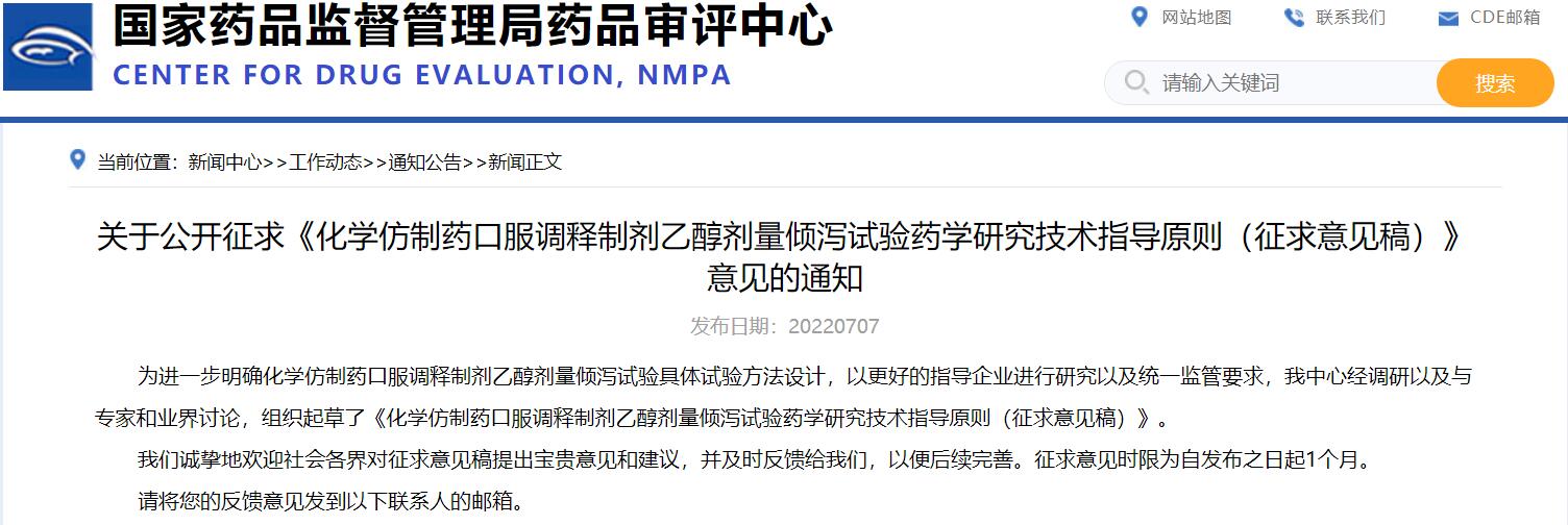 關于公開征求《化學仿制藥口服調釋制劑乙醇劑量傾瀉試驗藥學研究技術指導原則(征求意見稿)》意見的通知