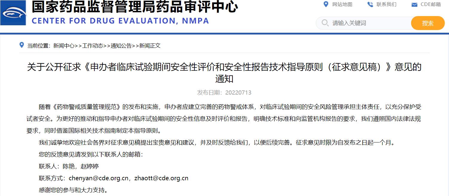 關于公開征求《申辦者臨床試驗期間安全性評價和安全性報告技術指導原則(征求意見稿)》意見的通知