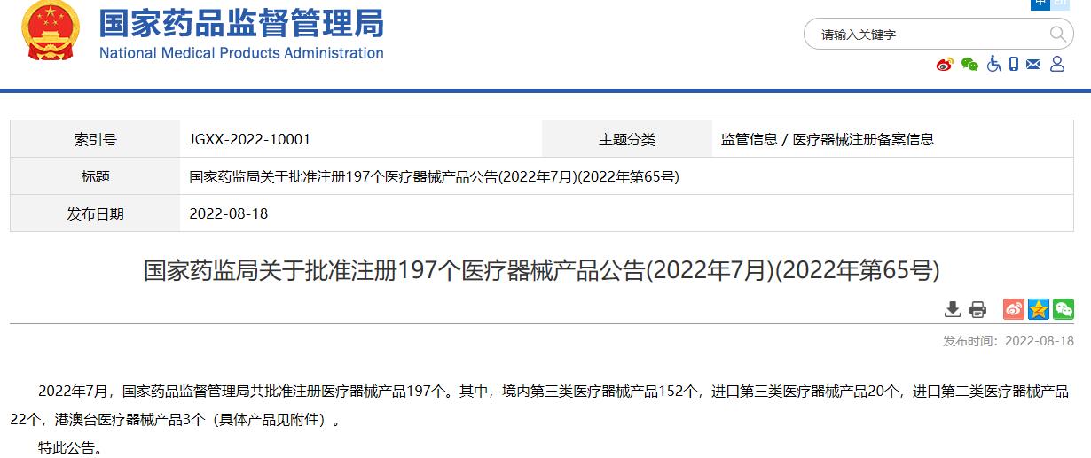 國(guó)家藥監(jiān)局關(guān)于批準(zhǔn)注冊(cè)197個(gè)醫(yī)療器械產(chǎn)品公告(2022年7月)(2022年第65號(hào))