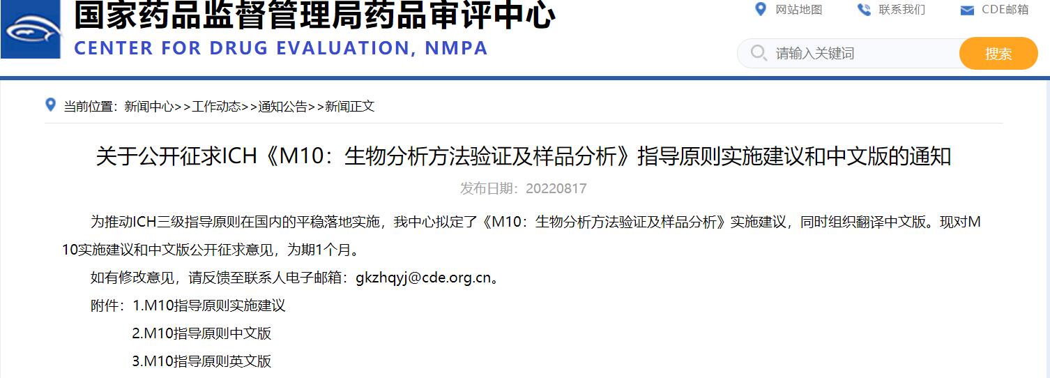 關(guān)于公開(kāi)征求ICH《M10:生物分析方法驗(yàn)證及樣品分析》指導(dǎo)原則實(shí)施建議和中文版的通知