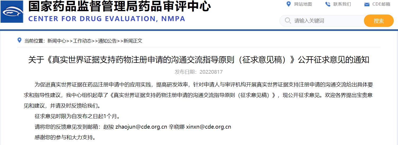 關(guān)于《真實(shí)世界證據(jù)支持藥物注冊(cè)申請(qǐng)的溝通交流指導(dǎo)原則(征求意見(jiàn)稿)》公開(kāi)征求意見(jiàn)的通知