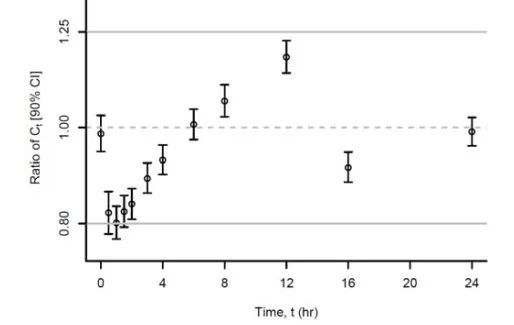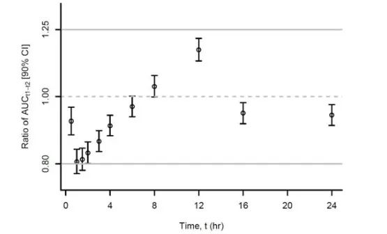 除此之外,該試驗中也分析了不同時間段,兩種制劑藥動學的差異,如圖所示: