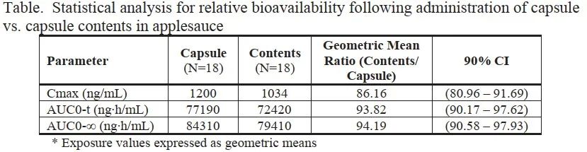 數據表明兩種服藥方式生物等效,表明該膠囊服用時可去掉囊殼,膠囊內容物與軟性食物一同服用。