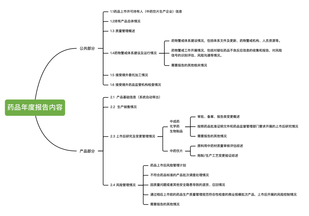 藥物警戒年度報告主要分為10部分,包括持有人信息、藥品信息、藥物警戒體系、各例藥品不良反應(yīng)報告、定期分析評估、風險評估和控制、上市后安全性研究、藥物警戒工作自評、其他說明及附件列表。