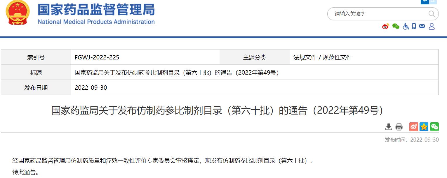 國家藥監局關于發布仿制藥參比制劑目錄(第六十批)的通告(2022年第49號)