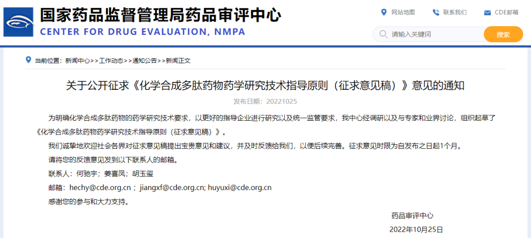 關于公開征求《化學合成多肽藥物藥學研究技術指導原則(征求意見稿)》意見的通知
