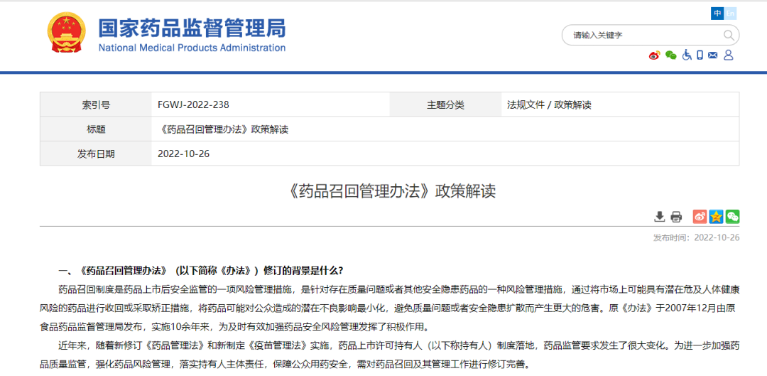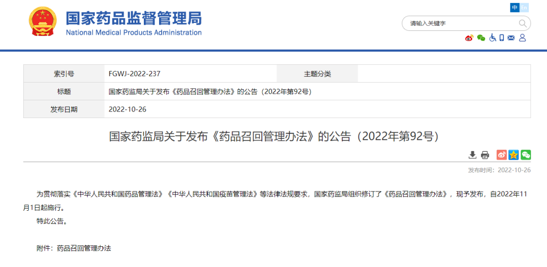 國家藥監局關于發布《藥品召回管理辦法》的公告(2022年第92號)