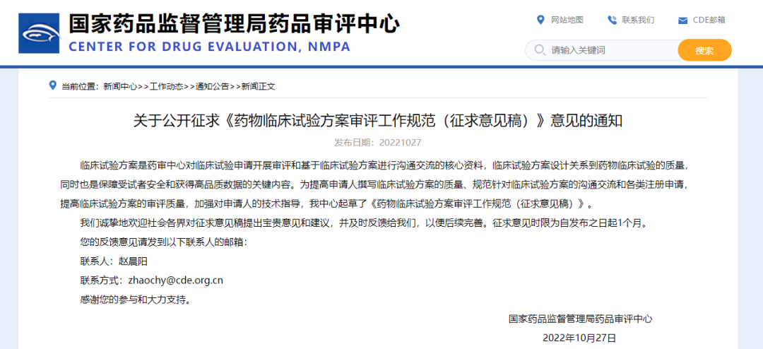 關于公開征求《藥物臨床試驗方案審評工作規范(征求意見稿)》意見的通知