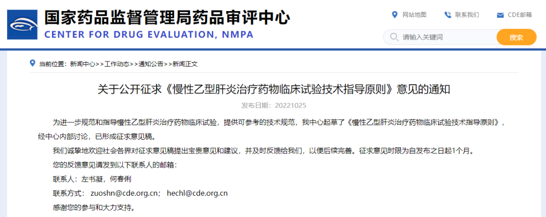 關于公開征求《慢性乙型肝炎治療藥物臨床試驗技術指導原則》意見的通知