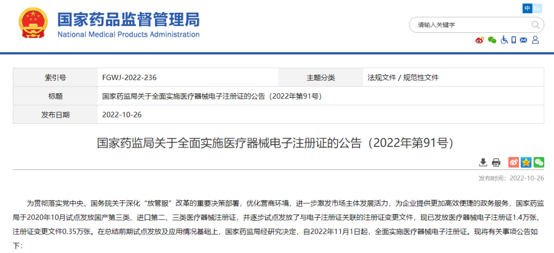 國家藥監局關于全面實施醫療器械電子注冊證的公告(2022年第91號)