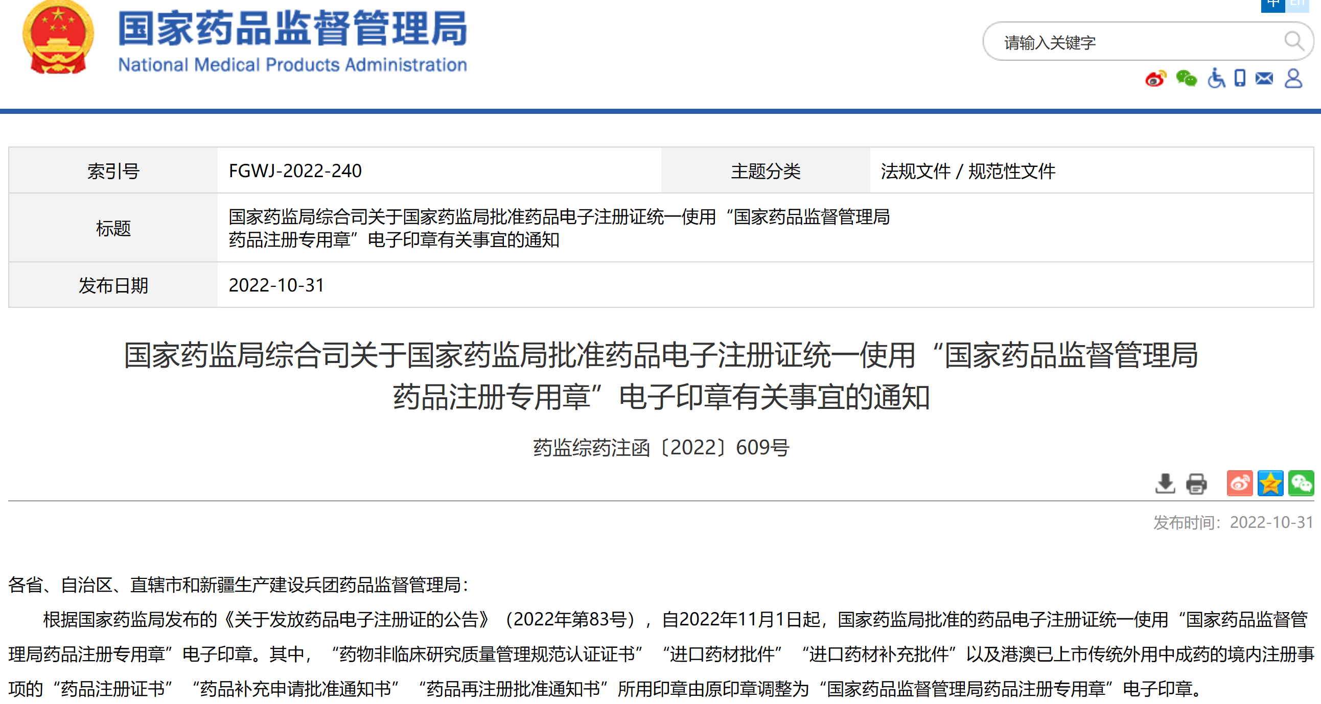 國家藥監局綜合司關于國家藥監局批準藥品電子注冊證統一使用“國家藥品監督管理局藥品注冊專用章”電子印章有關事宜的通知