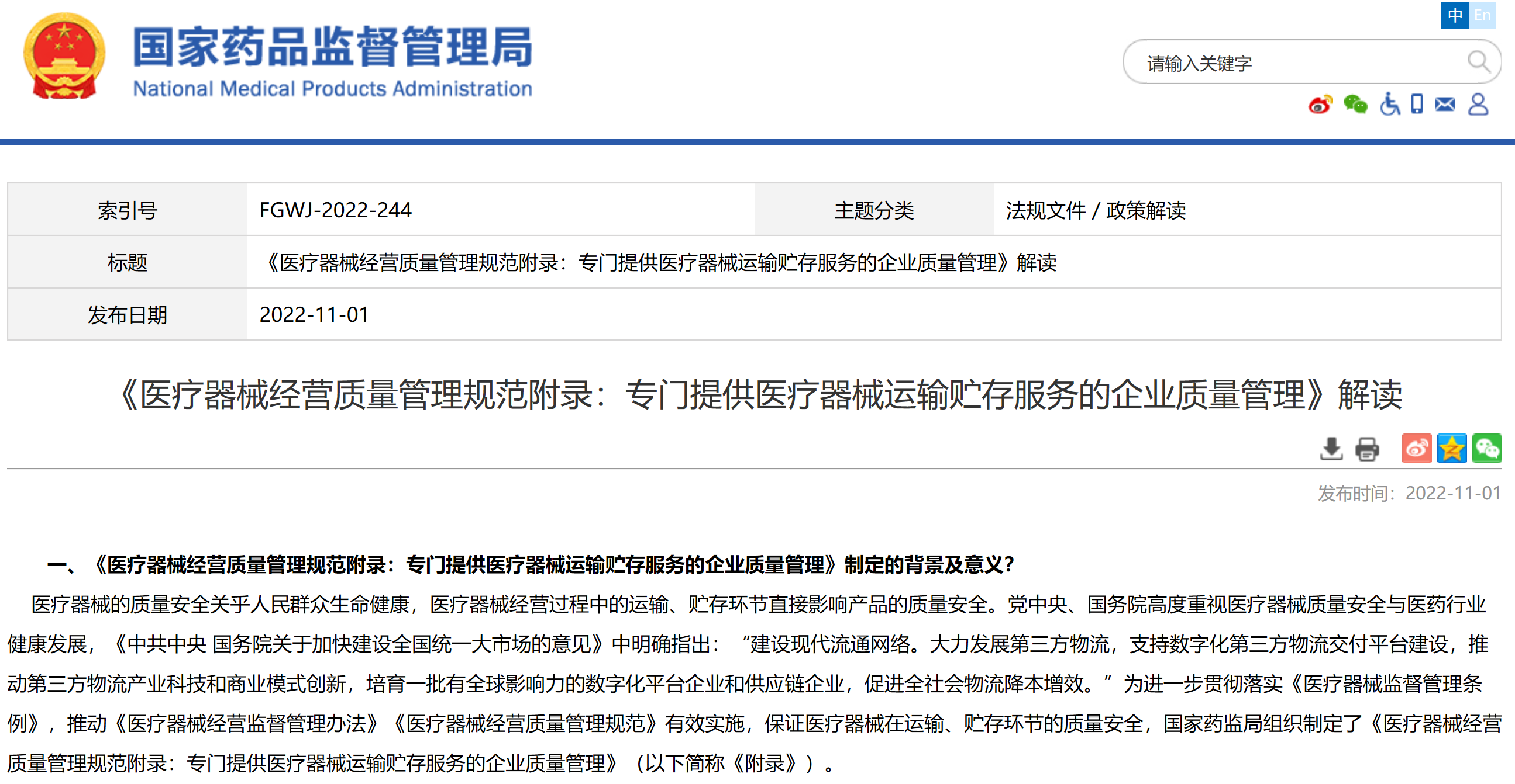 國家藥監局關于發布《醫療器械經營質量管理規范附錄:專門提供醫療器械運輸貯存服務的企業質量管理》的公告(2022年第94號)