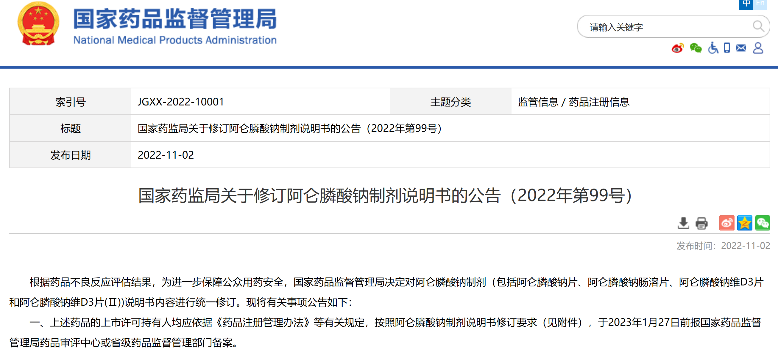 國家藥監局關于修訂阿侖膦酸鈉制劑說明書的公告(2022年第99號)
