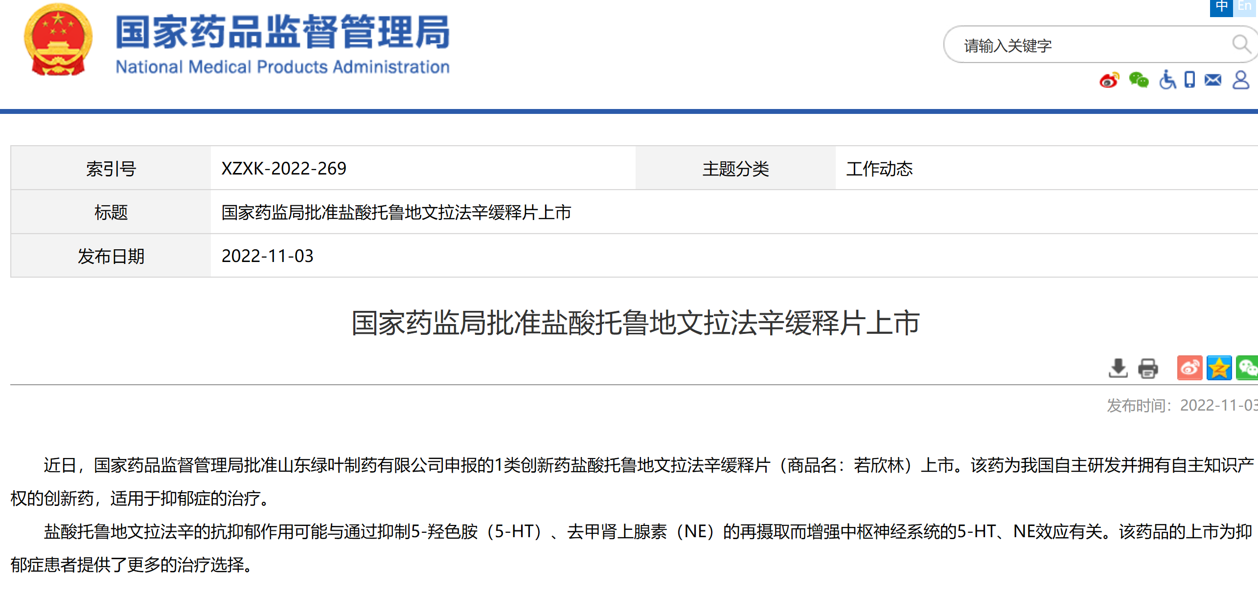 國家藥監局批準鹽酸托魯地文拉法辛緩釋片上市