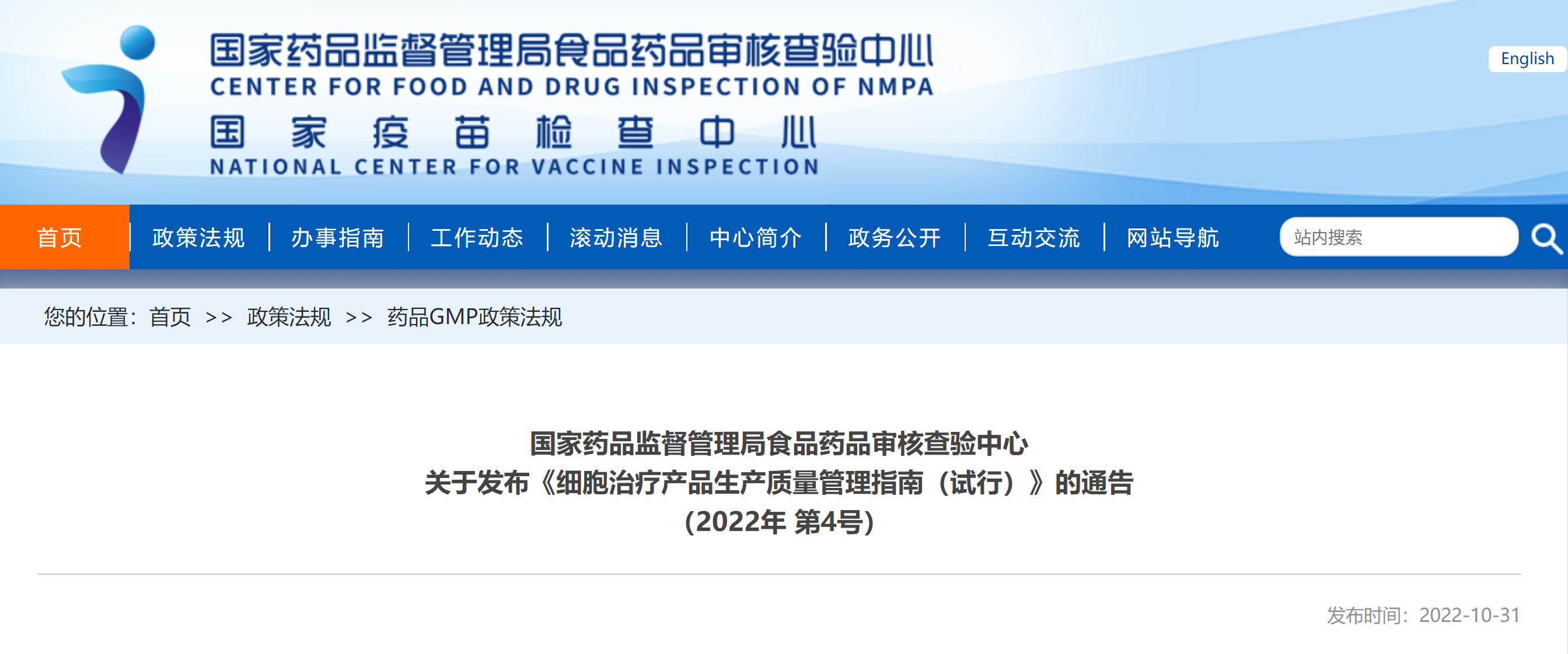 國家藥品監督管理局食品藥品審核查驗中心關于發布《細胞治療產品生產質量管理指南(試行)》的通告(2022年第4號)