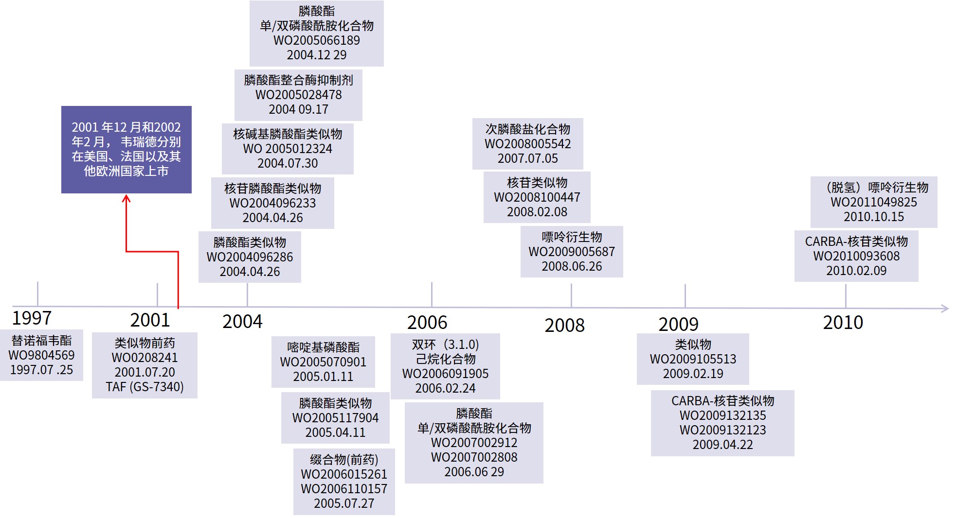 替諾福韋酯是吉利德公司在阿德福韋酯的基礎上成功開發的。替諾福韋酯是替諾福韋的前藥形式。替諾福韋是一種無環的5'-單磷酸腺苷類似物,不穩定、口服吸收較差。隨后,原研公司將其酯化為替諾福韋二吡呋酯(WO9804569),其口服吸收率明顯增加,并能提高細胞對其攝取能力。在此研究成果基礎上,為進一步提高其口服吸收率和細胞對其攝取能力,吉利德公司申請了專利WO9905150,將其進一步制備為替諾福韋二吡呋酯的富馬酸鹽形式,2001年12月和2002年2月,韋瑞德分別在美國、法國以及其他歐洲國家上市,用于治療HIV感染。
