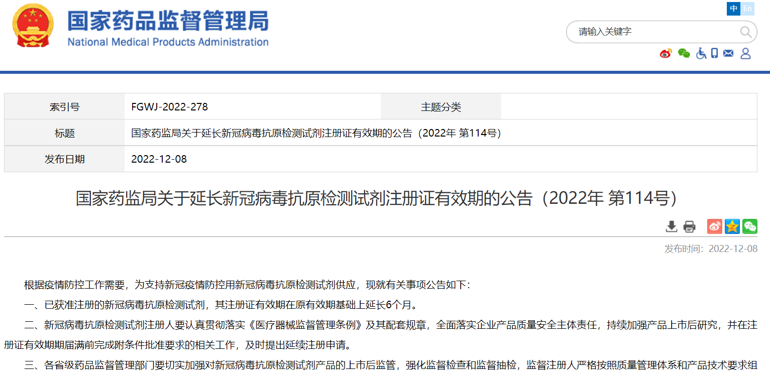 國家藥監局關于延長新冠病毒抗原檢測試劑注冊證有效期的公告(2022年 第114號)