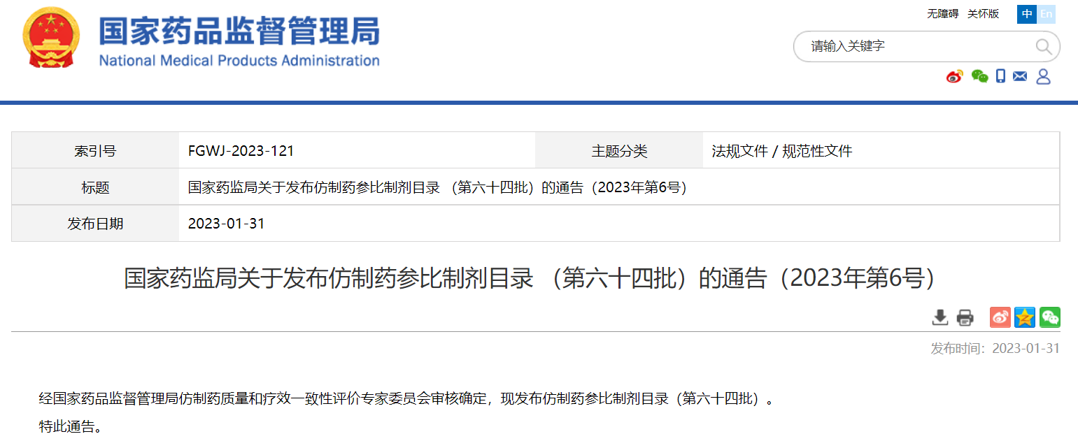國家藥監局關于發布仿制藥參比制劑目錄 (第六十四批)的通告(2023年第6號)