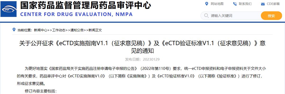 關于公開征求《eCTD實施指南V1.1(征求意見稿)》及《eCTD驗證標準V1.1(征求意見稿)》意見的通知