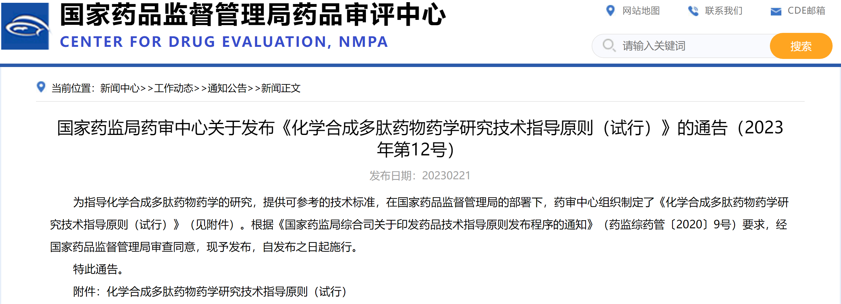 國家藥監局藥審中心關于發布《化學合成多肽藥物藥學研究技術指導原則(試行)》的通告(2023年第12號)