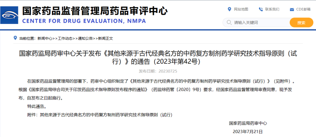 國家藥監(jiān)局藥審中心關于發(fā)布《其他來源于古代經典名方的中藥復方制劑藥學研究技術指導原則(試行)》的通告(2023年第42號)