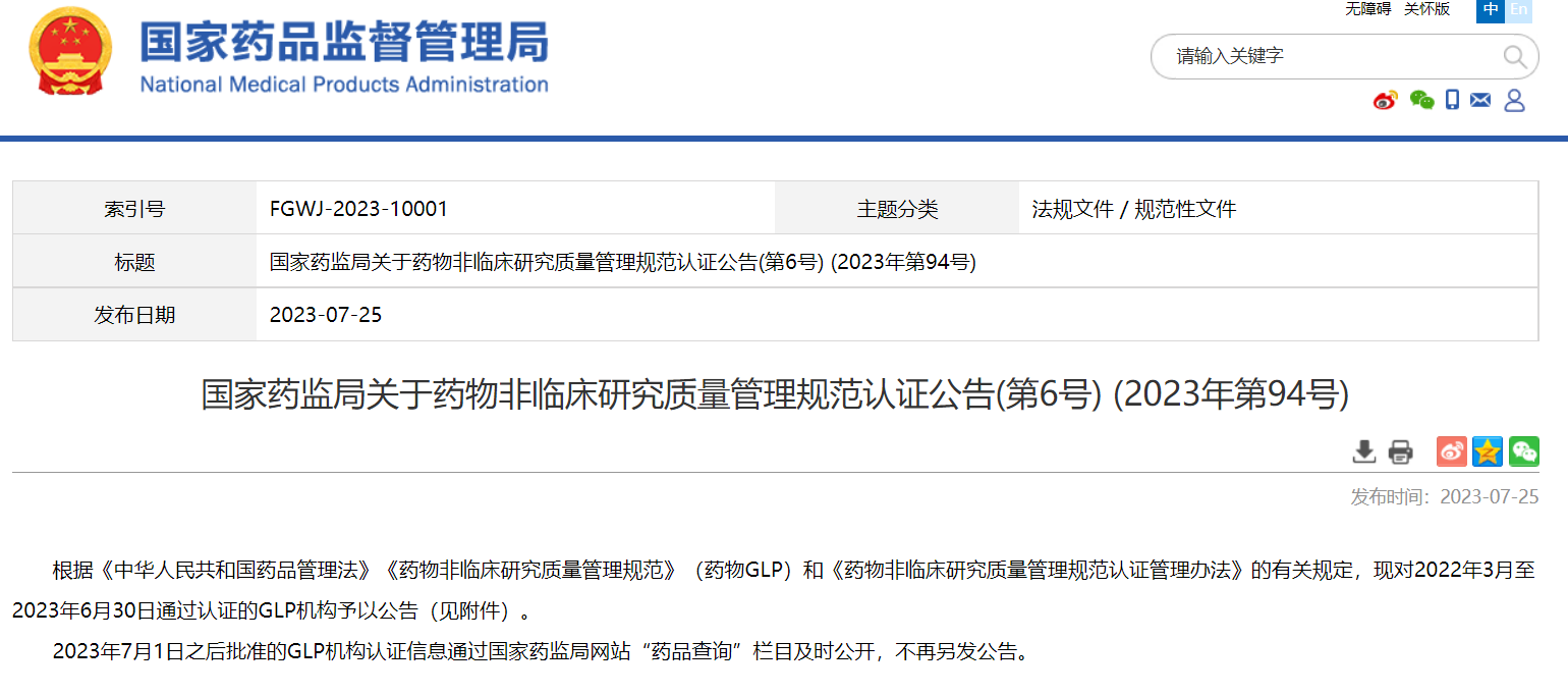 國家藥監(jiān)局關于藥物非臨床研究質量管理規(guī)范認證公告(第6號) (2023年第94號)