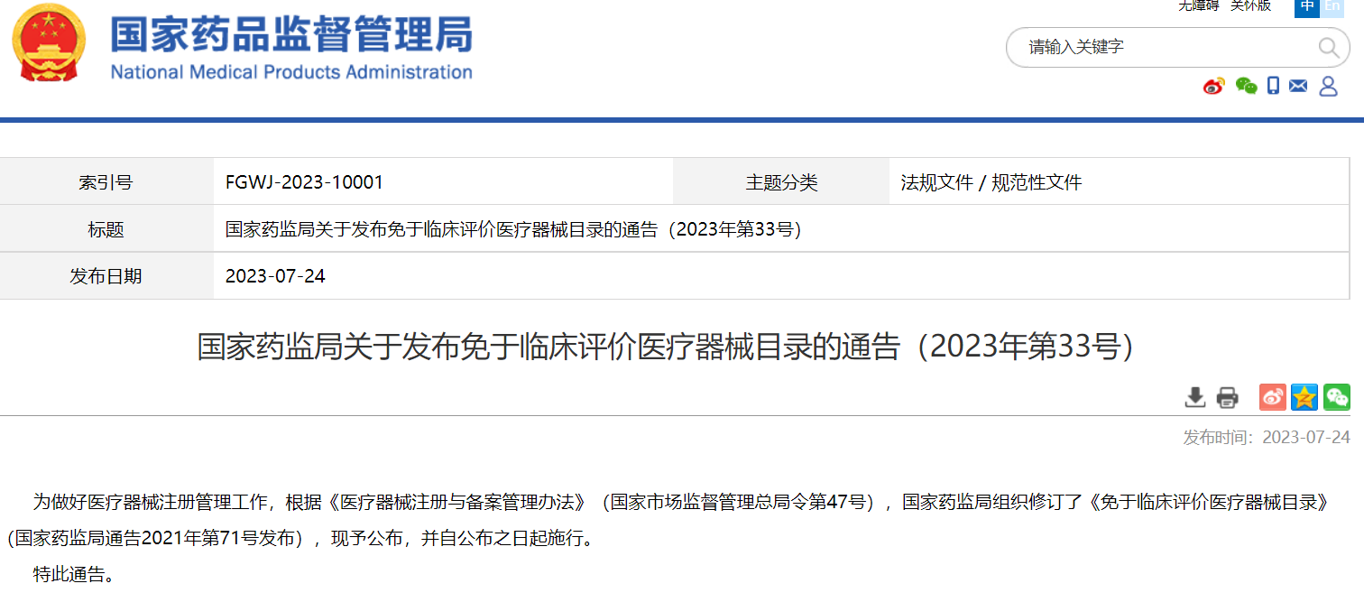 國家藥監(jiān)局關于發(fā)布免于臨床評價醫(yī)療器械目錄的通告(2023年第33號)