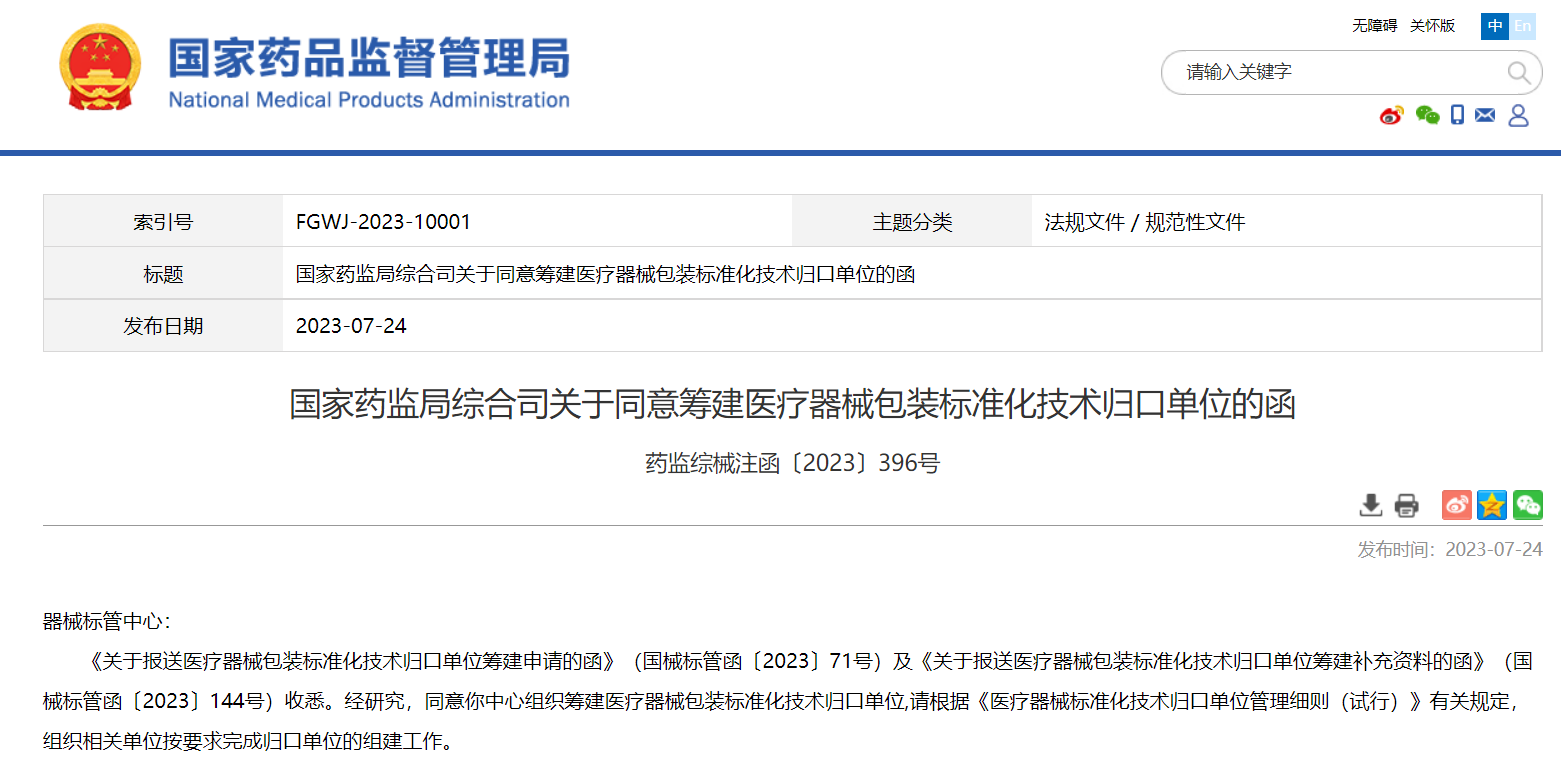 國家藥監(jiān)局綜合司關于同意籌建醫(yī)療器械包裝標準化技術歸口單位的函