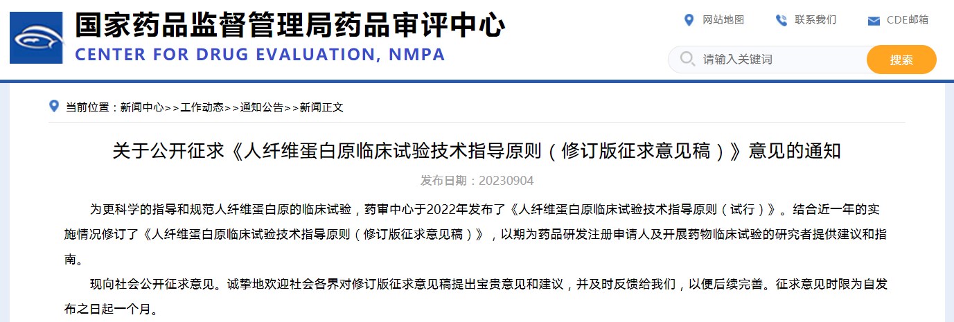 關于公開征求《人纖維蛋白原臨床試驗技術指導原則(修訂版征求意見稿)》意見的通知