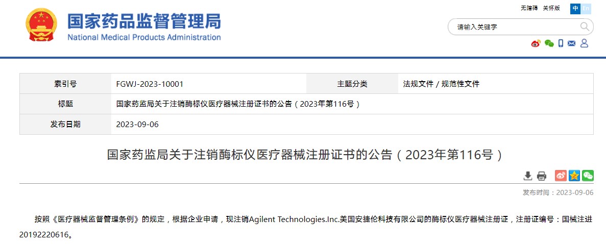 國家藥監局關于注銷酶標儀醫療器械注冊證書的公告(2023年第116號)