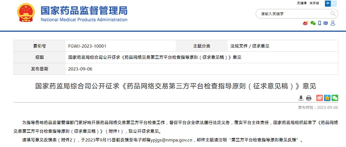 國家藥監局綜合司公開征求《藥品網絡交易第三方平臺檢查指導原則(征求意見稿)》意見