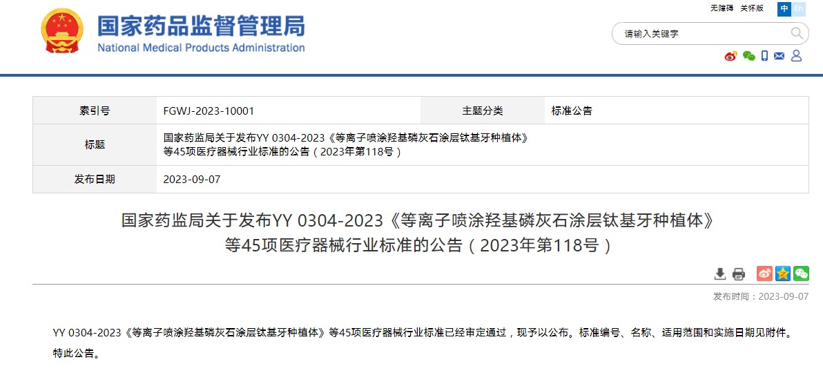 國家藥監局關于發布YY 0304-2023《等離子噴涂羥基磷灰石涂層鈦基牙種植體》 等45項醫療器械行業標準的公告(2023年第118號)
