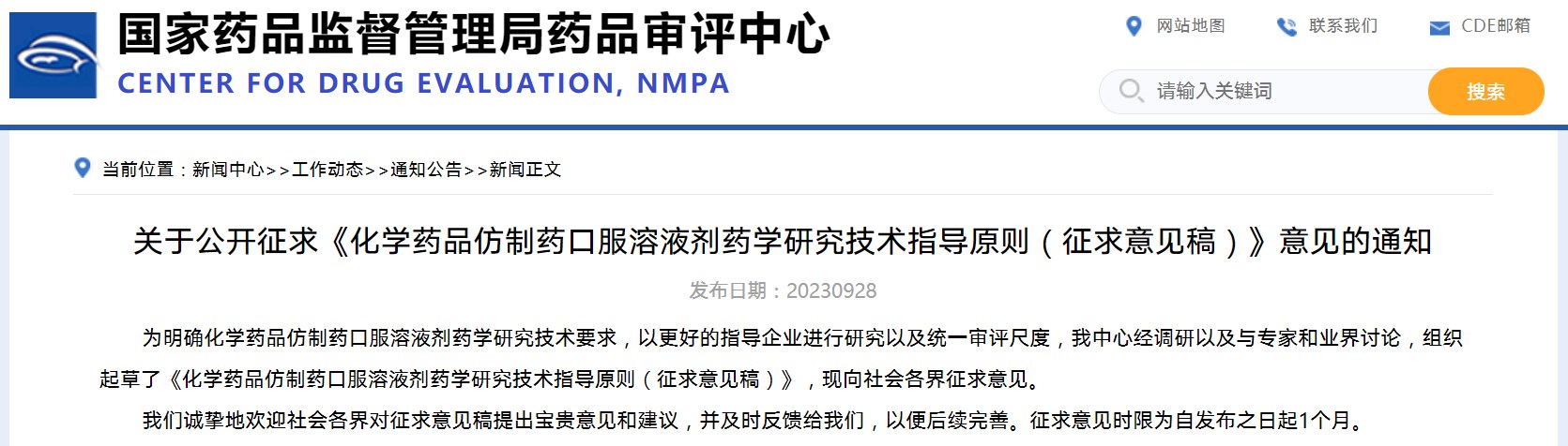 關(guān)于公開征求《化學(xué)藥品仿制藥口服溶液劑藥學(xué)研究技術(shù)指導(dǎo)原則》意見的通知
