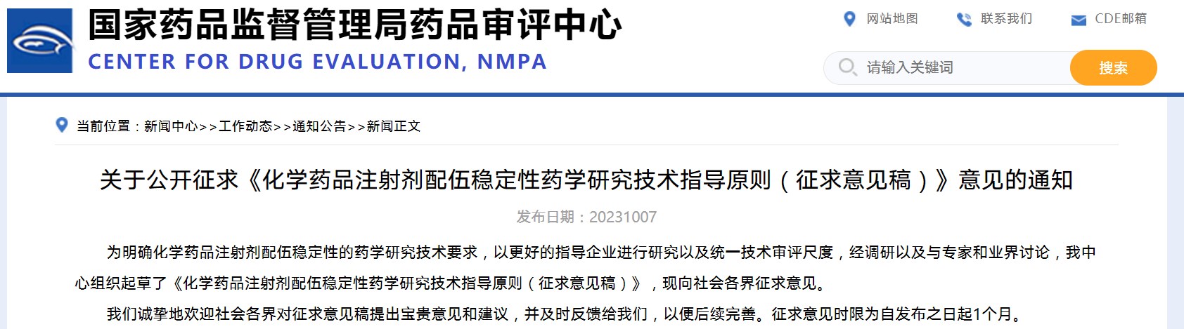 關(guān)于公開征求《化學(xué)藥品注射劑配伍穩(wěn)定性藥學(xué)研究技術(shù)指導(dǎo)原則》意見的通知