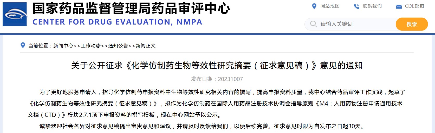 關(guān)于公開征求《化學(xué)仿制藥生物等效性研究摘要》意見的通知