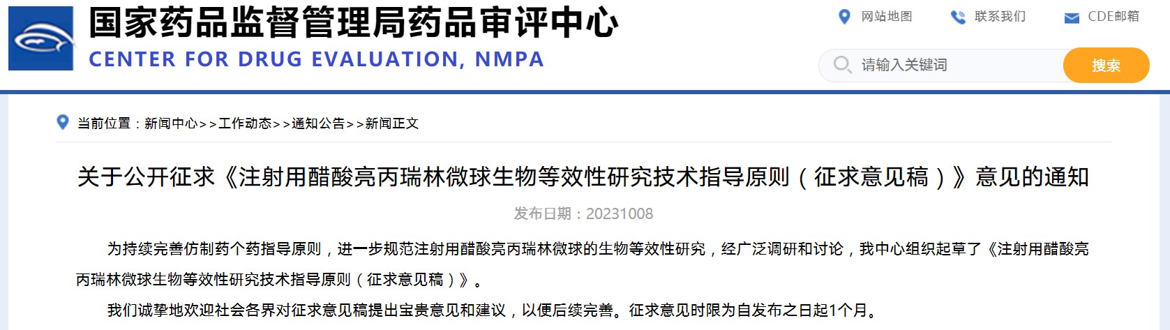 關(guān)于公開征求《注射用醋酸亮丙瑞林微球生物等效性研究技術(shù)指導(dǎo)原則(征求意見稿)》意見的通知
