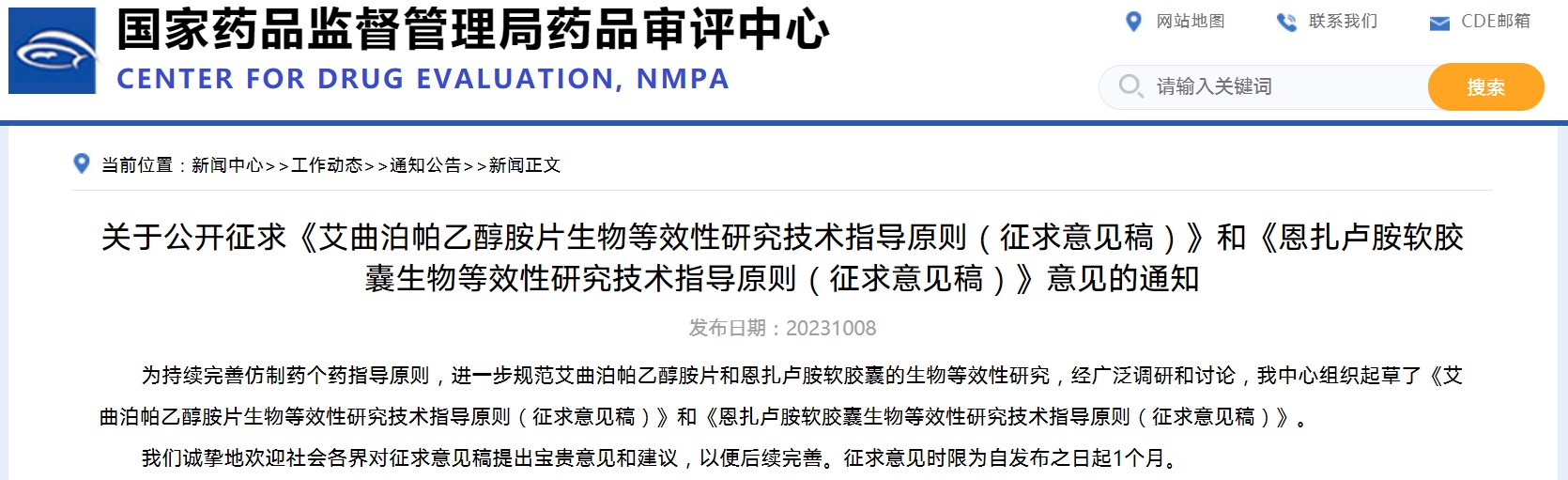 關(guān)于公開征求《艾曲泊帕乙醇胺片生物等效性研究技術(shù)指導(dǎo)原則(征求意見稿)》和《恩扎盧胺軟膠囊生物等效性研究技術(shù)指導(dǎo)原則(征求意見稿)》意見的通知