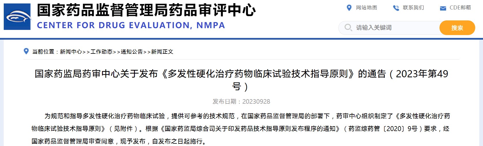國家藥監(jiān)局藥審中心關(guān)于發(fā)布《多發(fā)性硬化治療藥物臨床試驗(yàn)技術(shù)指導(dǎo)原則》的通告(2023年第49號)