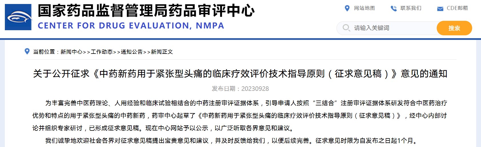 關(guān)于公開征求《中藥新藥用于緊張型頭痛的臨床療效評價(jià)技術(shù)指導(dǎo)原則(征求意見稿)》意見的通知
