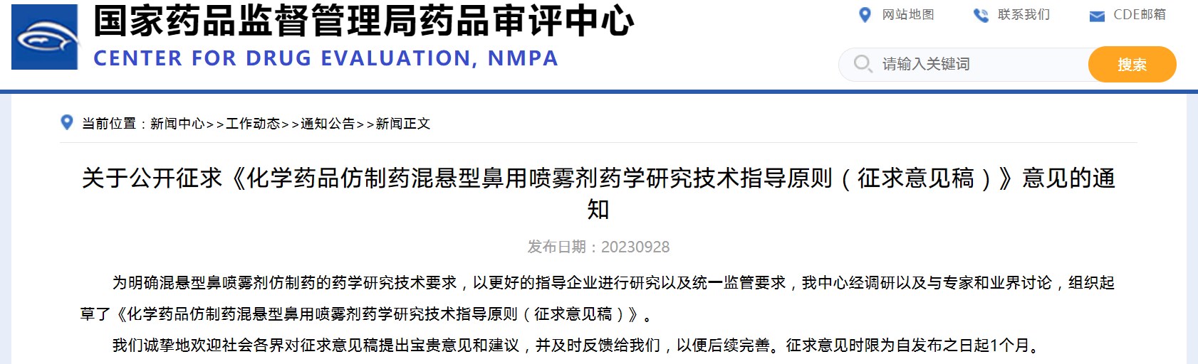 關(guān)于公開征求《化學(xué)藥品仿制藥混懸型鼻用噴霧劑藥學(xué)研究技術(shù)指導(dǎo)原則(征求意見稿)》意見的通知