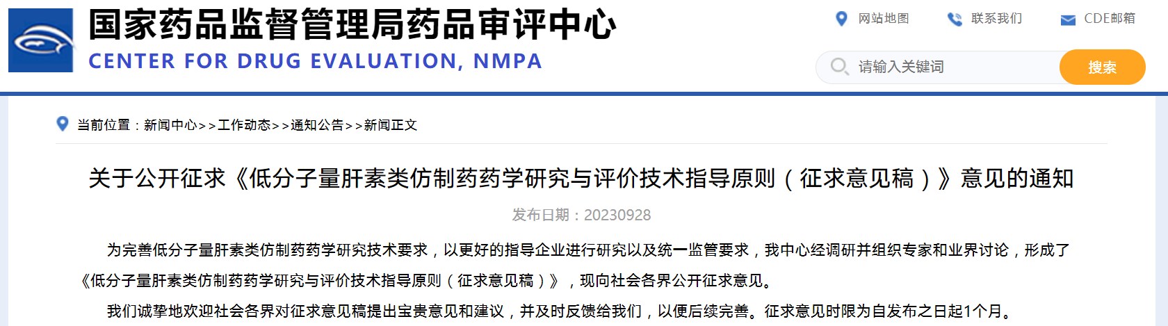 關(guān)于公開征求《低分子量肝素類仿制藥藥學(xué)研究與評價(jià)技術(shù)指導(dǎo)原則(征求意見稿)》意見的通知