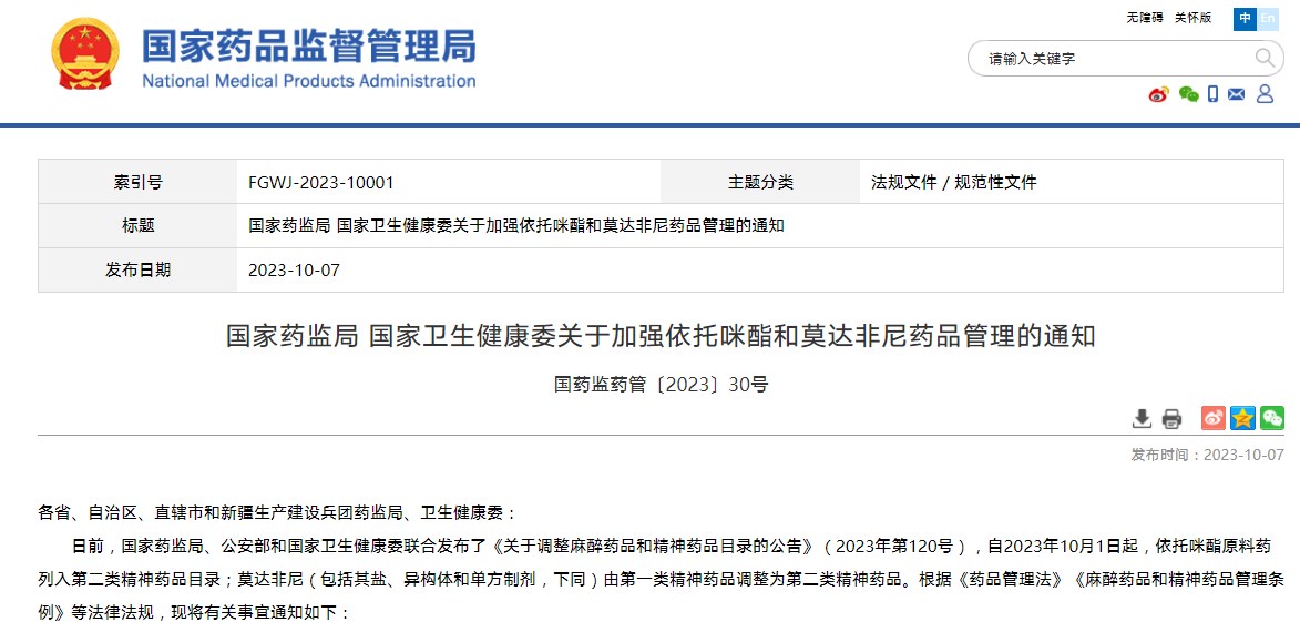 國家藥監(jiān)局 國家衛(wèi)生健康委關(guān)于加強(qiáng)依托咪酯和莫達(dá)非尼藥品管理的通知