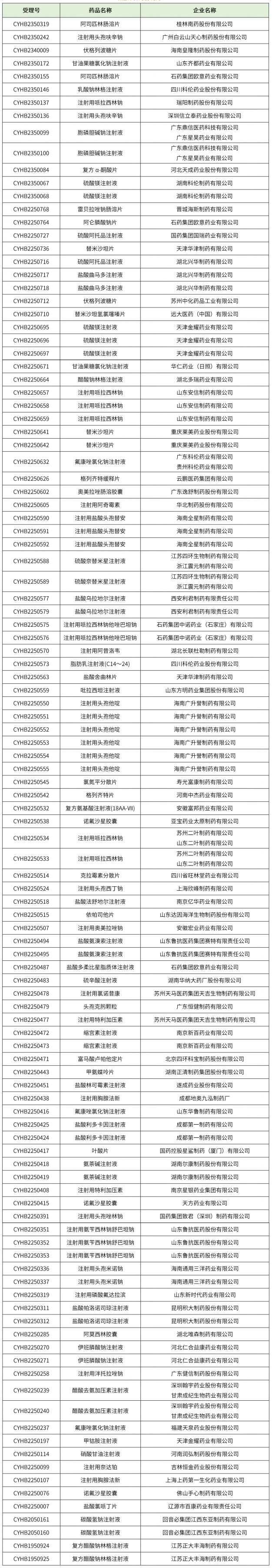 化藥67個(阿司匹林腸溶片、注射用頭孢呋辛鈉、硫酸阿托品注射液、醋酸鈉林格注射液、注射用哌拉西林鈉、替米沙坦片、氯氮平分散片、鹽酸氨溴索注射液、注射用氨芐西林鈉舒巴坦鈉、復方醋酸鈉林格注射液等),藥物詳細信息見下表。