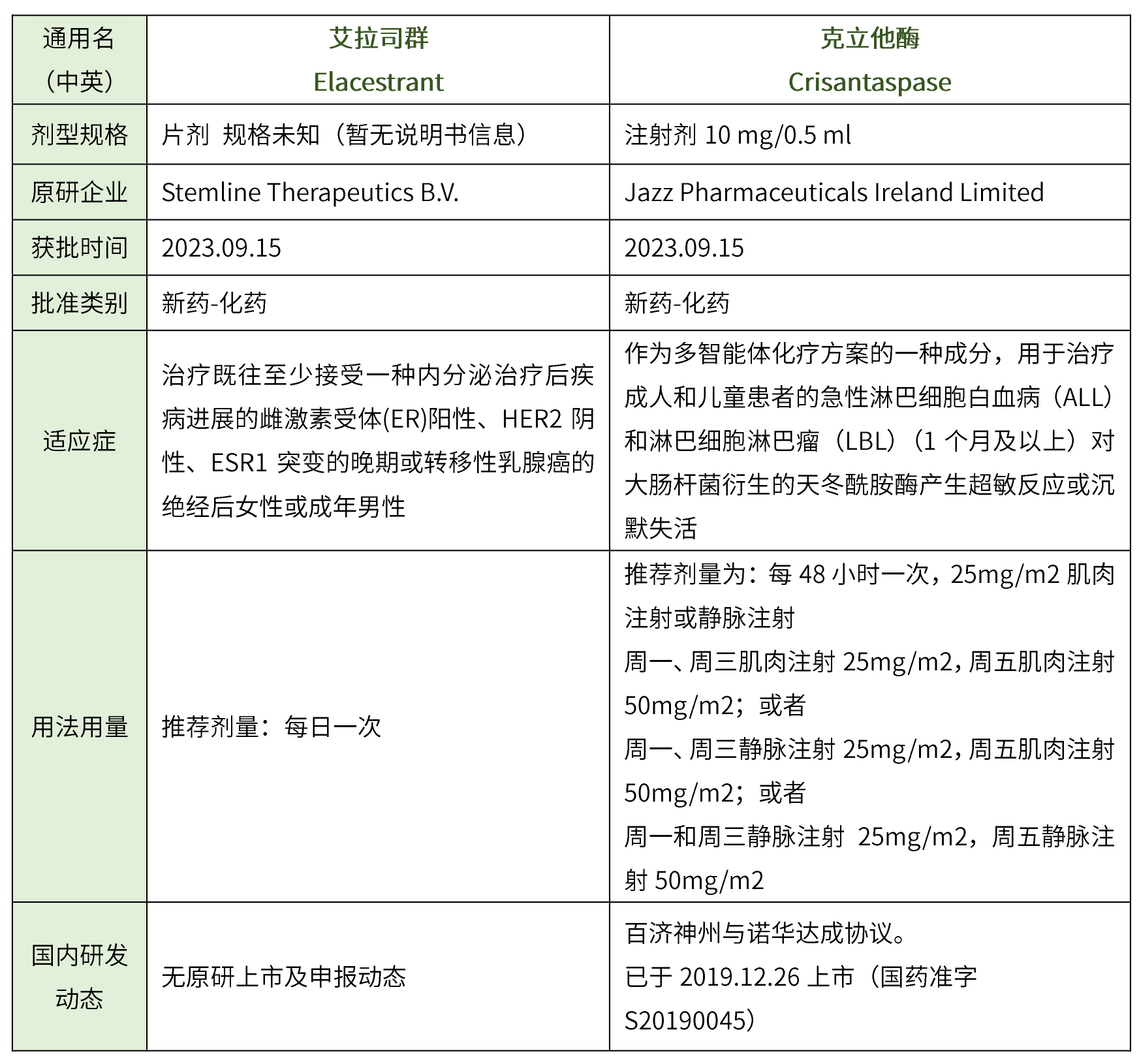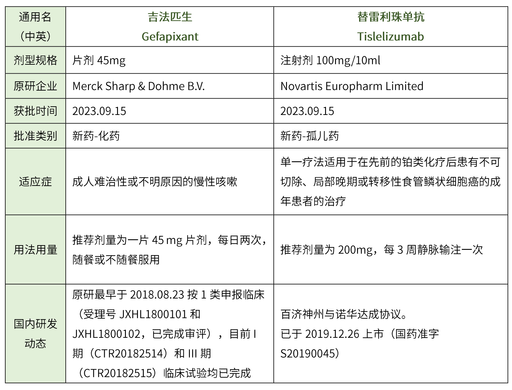 共計5個,其中化藥3個(吉法匹生片、艾拉司群片、克立他酶注射液,生物藥2個(替雷利珠單抗注射液、艾可瑞妥單抗注射用濃溶液),藥物詳細信息見下表。